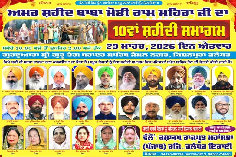 ਜਲੰਧਰ, 26-3-2026 (ਨਰਿੰਦਰ ਕਸ਼ਯਪ) – ਕਸ਼ਯਪ ਰਾਜਪੂਤ ਮਹਾਂਸਭਾ ਜਲੰਧਰ ਇਕਾਈ ਵੱਲੋਂ ਅਮਰ ਸ਼ਹੀਦ ਬਾਬਾ ਮੋਤੀ ਰਾਮ ਮਹਿਰਾ ਜੀ ਸ਼ਹੀਦੀ ਨੂੰ ਸਮਰਪਿਤ 10ਵਾਂ ਸ਼ਹੀਦੀ ਸਮਾਗਮ 29 ਮਾਰਚ 2026 ਨੂੰ ਕਰਵਾਇਆ ਜਾ ਰਿਹਾ ਹੈ। ਇਸ ਸੰਬੰਧ ਵਿਚ ਜਾਣਕਾਰੀ ਦਿੰਦੇ ਹੋਏ ਸਭਾ ਦੇ ਚੇਅਰਮੈਨ ਪਰਮਜੀਤ ਸਿੰਘ ਨੇ ਦੱਸਿਆ ਕਿ ਸਭਾ ਵੱਲੋਂ ਗੁਰਦੁਆਰਾ ਸ਼੍ਰੀ ਤੇਗ ਬਹਾਦਰ ਸਾਹਿਬ ਜੈਮਲ ਨਗਰ ਵਿਖੇ ਇਹ ਸ਼ਹੀਦੀ ਸਮਾਗਮ ਕਰਵਾਇਆ ਜਾਏਗਾ। ਇਸ ਦੌਰਾਨ ਸਵੇਰੇ 10 ਵਜੇ ਸ਼੍ਰੀ ਸੁਖਮਨੀ ਸਾਹਿਬ ਦਾ ਪਾਠ ਕਰਵਾਇਆ ਜਾਏਗਾ ਜਿਸਦੇ ਉਪਰੰਤ ਰਾਗੀ-ਢਾਡੀ ਜੱਥੇ ਬਾਬਾ ਮੋਤੀ ਰਾਮ ਮਹਿਰਾ ਜੀ ਵੱਲੋਂ ਕੀਤੀ ਗਈ ਦੁੱਧ ਦੀ ਸੇਵਾ ਅਤੇ ਸ਼ਹੀਦੀ ਦੇ ਪ੍ਰਸੰਗ ਨਾਲ ਸੰਗਤ ਨੂੰ ਜਾਣੂ ਕਰਵਾਣਗੇ। ਇਸ ਮੌਕੇ ਗੁਰੂ ਦਾ ਲੰਗਰ ਅਤੁੱਟ ਵਰਤੇਗਾ।